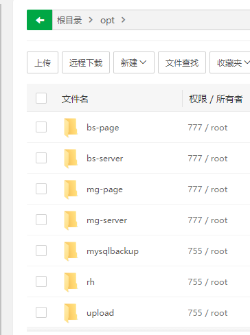 3、 上传部署包中的opt压缩包,解压后修改配置文件,需要修改的文件共4个,bs-server/config下的app-env.properties、app-host.properties,mg-server/config下的app-env.properties、app-host.properties,都只改ip,端口不动,细节如下。