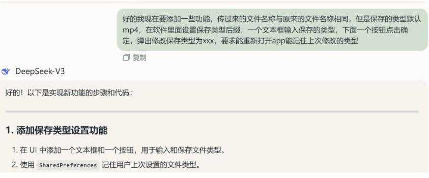 这几天deepseek比较火,心血来潮我就又试了一下,r1太卡了,我使用的用的是v3模型,让我感到震惊的是,我直接把代码复制进去,居然没有报错,虽然也经历过一些毛病,好在我了解一点安卓开发的流程,APP基本还算能用。然后我还加了一下功能,比如选择保存的后缀名,一件清空保存目录。用文心一言画了个图标。