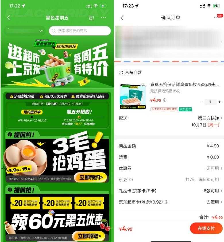 京东APP搜索“周五神价888”->指定时间抢10-9亓券,可以买鸡蛋、卷纸等等