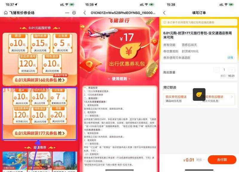 飞猪0.01元买7元火车票通用券