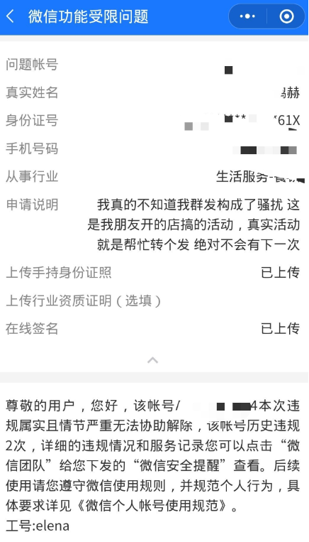 1:先按照微信提示操作填写资料,上传相关证明,不严重的此时就能解除限制,如果人工判定违规不解除,就继续按照提示步骤继续操作