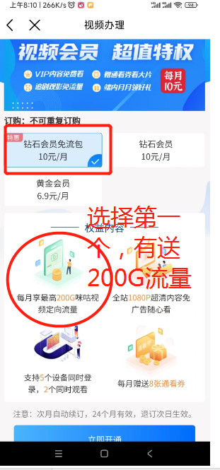 4.搜索咪咕,找到开通咪咕会员,选择10元/月的,送的200G咪咕流量,然后下载咪咕视频去下载电影(自动默认咪咕专属流量)