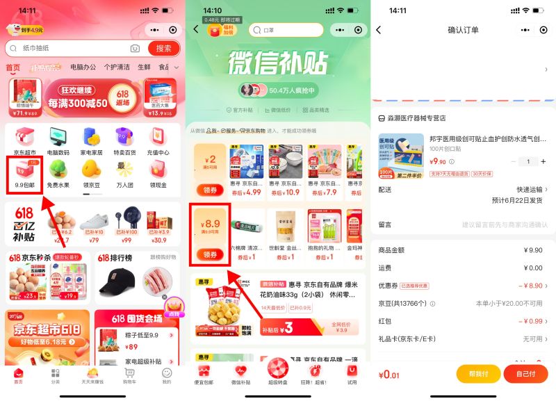 进入“微信-发现-购物”->点击“9.9包邮”->底部“微信补贴”->领取9.9减8.9元券,任选一个实物1元包邮到手