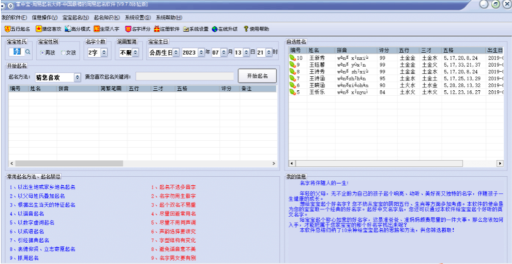 2.一次可生产数千个好名字,您还可根据笔画数、拼音、五行等筛选喜欢的名字。