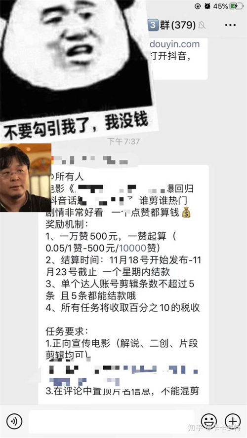 第二种就是接一些上映影视剧的宣发。有很多的电商在刚上映的时候需要在抖音造势,所以他们会发布宣发任务,给我们提供素材,让我们进行剪辑发布。素材选择上面受限,但是收益更高,一万赞的佣金在300元以上。