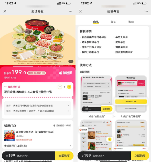美团外卖199元购海底捞4人餐