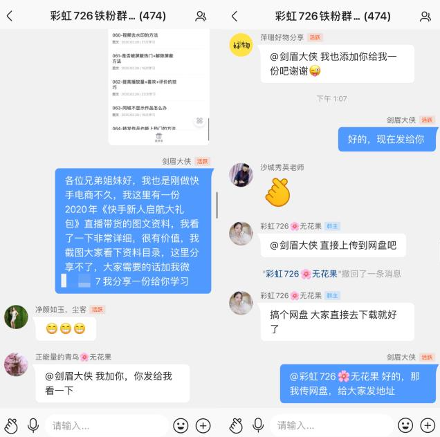 这个就更简单了,直接简单粗暴的送资料,这个群是交流什么的,你就送什么资料,比如这个无花果的群是交流快手电商创业的,那么我就到网上找一套关于《快手电商创业》的课程,然后包装一下,截个图,丢到群里,配上一段诱饵话术,搞定!