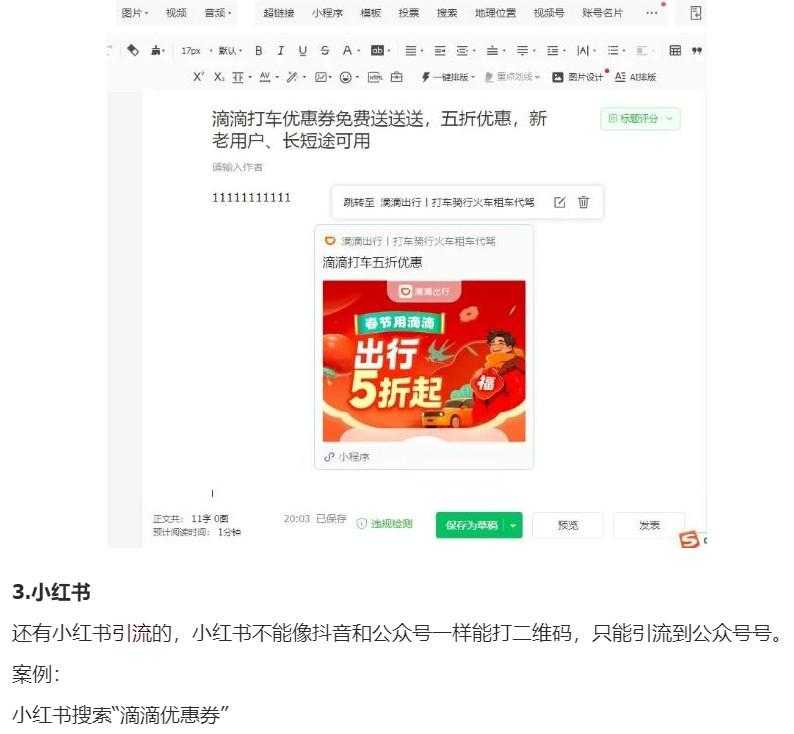 注册公众号,然后用AI写软文广告,插入滴滴优惠券链接。