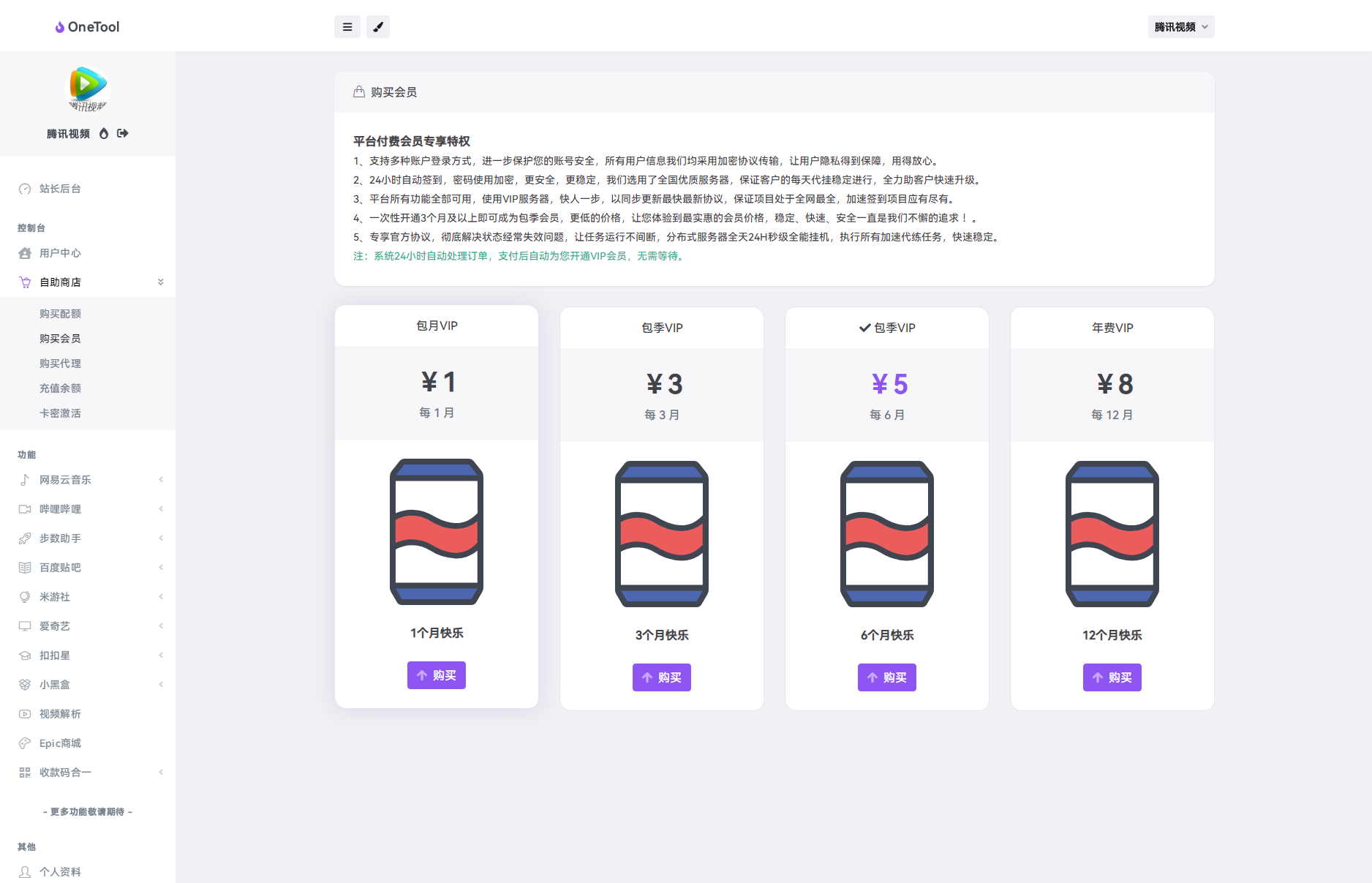 可以帮助用户快速完成各种任务。例如网易云音乐每日签到、每日云贝、打卡 300 首歌曲、音乐人每日任务等;WX 运动健身记步范围设定, QQ 空间秒赞秒评;哔哩哔哩视频短片每日签到、每日在线观看、投币机、动漫作品每日签到、分享视频、天选抽奖活动;百度贴吧签到;爱奇艺 VIP 每日任务、每日抽奖活动、二端每日签到等等,都可以通过 OneTool 进行快速操作。