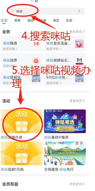 4.搜索咪咕,找到开通咪咕会员,选择10元/月的,送的200G咪咕流量,然后下载咪咕视频去下载电影(自动默认咪咕专属流量)