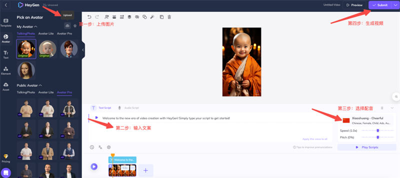 一种是使用heygen,效果很好,缺点一个账号只送1积分试用,两个视频就用完了。