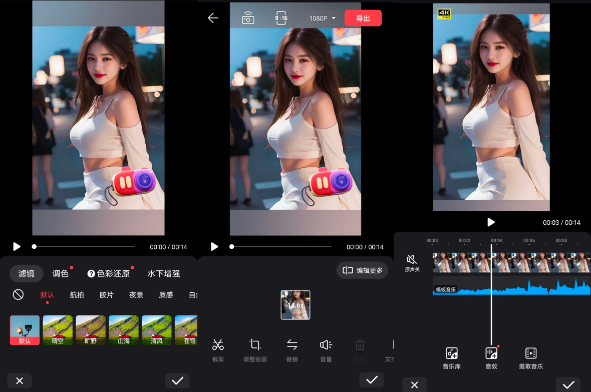 4、海量模板- 包括旅行、Vlog、聚会、运动、节奏、航拍、小人国特效、亲子、美食、节日等多样创意模板- 适配横屏和竖屏视频,轻松剪辑,让您在社交媒体上制霸